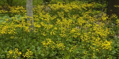 Golden Groundsel, also known as Packera aurea or Golden Ragwort, is another early bloomer. It produces bright yellow flowers on 10” stalks; its leave form a semi-evergreen groundcover. It grows well in moist, shady areas.