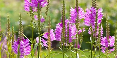 Physostegia virginiana, or Obedient Plant, is a late bloomer with pink/lavender flowers. Growing up to 5 feet tall, it can be aggressive, like its relatives in the mint family. It feeds pollinators, including bees, butterflies, and hummingbirds.