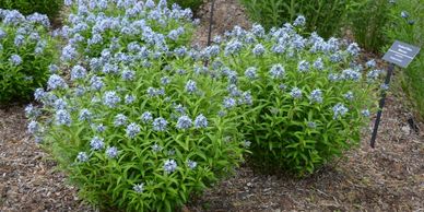 Amsonia tabernaemontana is a low-maintenance perennial with soft blue spring flowers and long-season interest, culminating in a brilliant golden-yellow fall display. It is clump forming and grows into a dense, shrub-like mound.